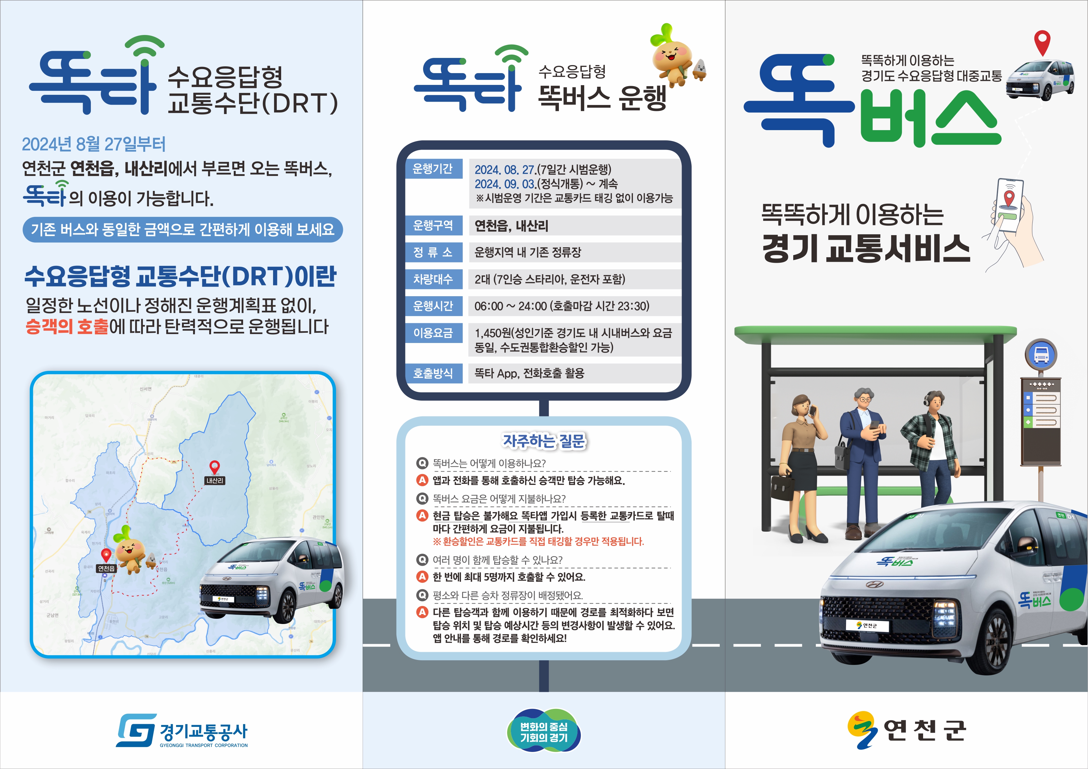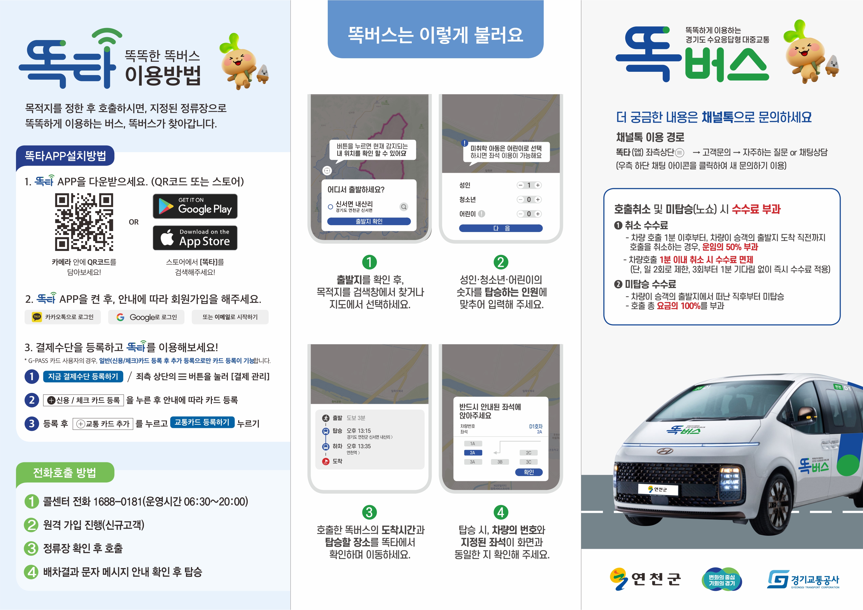 앱설치: 똑타 설치 후 회원가입 하면 앱으로 호출 가능(연천읍~ 내산리(수덕원) 이용) 버스비용